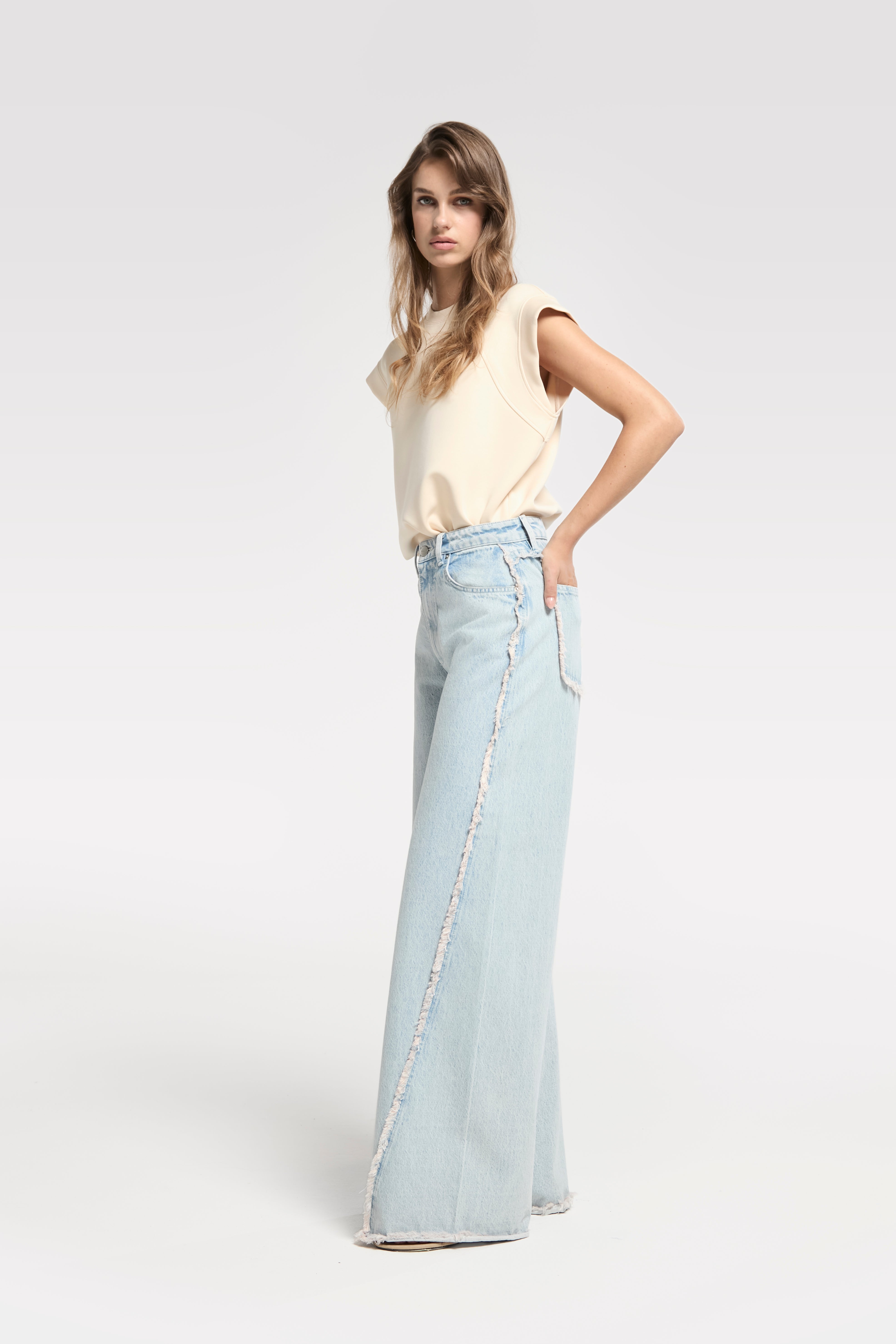 Effortlessly chic with a playful twist, the Palazzo Jeans with Fringes in Vintage Blue blend classic denim with contemporary detailing. Crafted from 100% Cotton, these jeans offer soft, breathable comfort and a relaxed, wide-leg silhouette that moves gracefully with every step. The fringe detailing along the hem adds a subtle statement, creating a dynamic, fashion-forward look that pairs beautifully with simple tops or structured jackets.