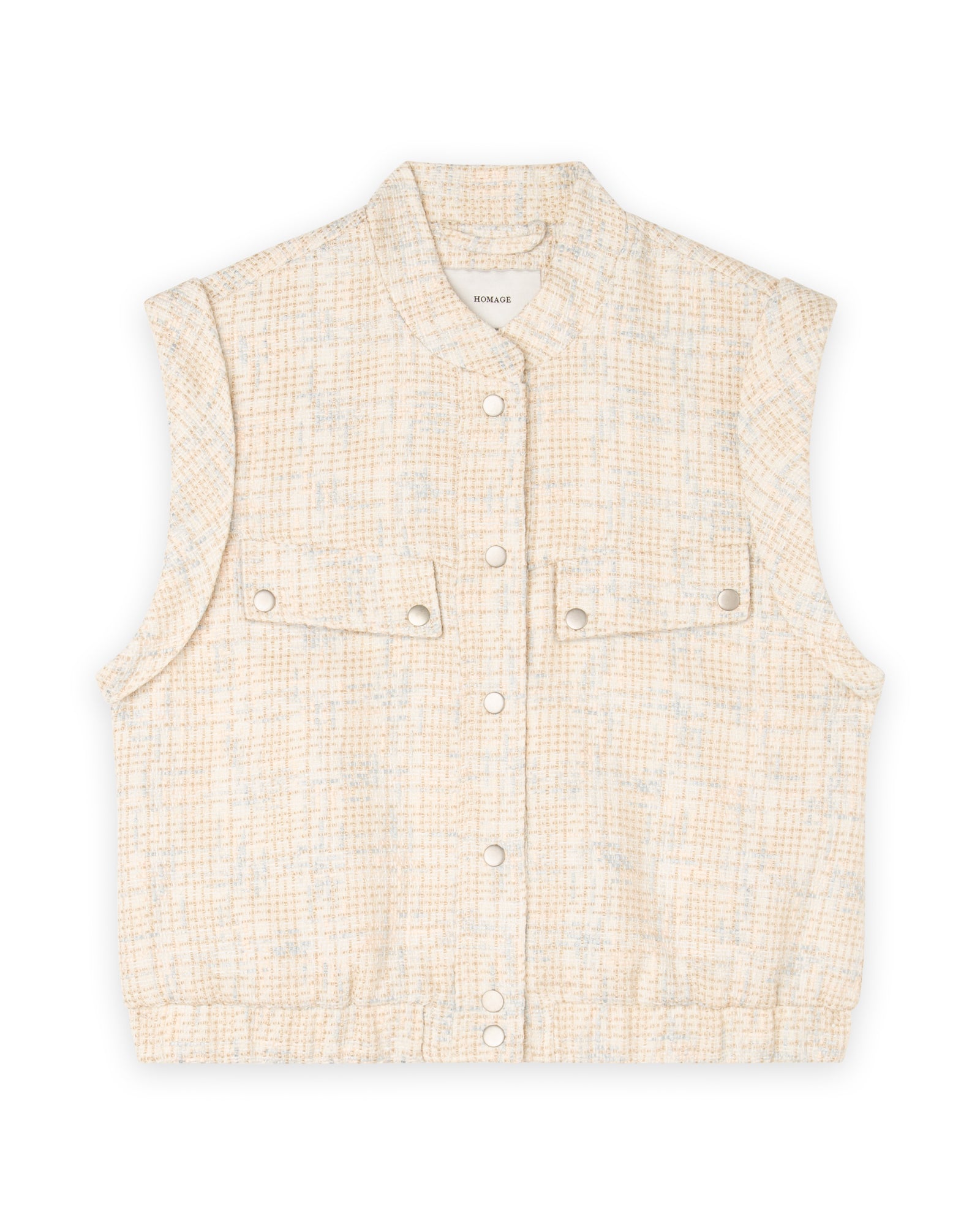 A modern twist on a timeless texture, the Tweed Bomber Waistcoat in Coral Mix blends classic craftsmanship with contemporary ease. Tailored from a rich, tactile blend of 3% Wool, 22% Acrylic, 13% Cotton, and 62% Polyester, it offers warmth, structure, and comfort in equal measure. The bomber-inspired silhouette adds a relaxed edge to the traditional tweed weave, while the coral mix tones bring a fresh, vibrant feel. Perfect for layering over shirts, knits, or dresses, it transitions effortlessly from day to night with understated sophistication.
