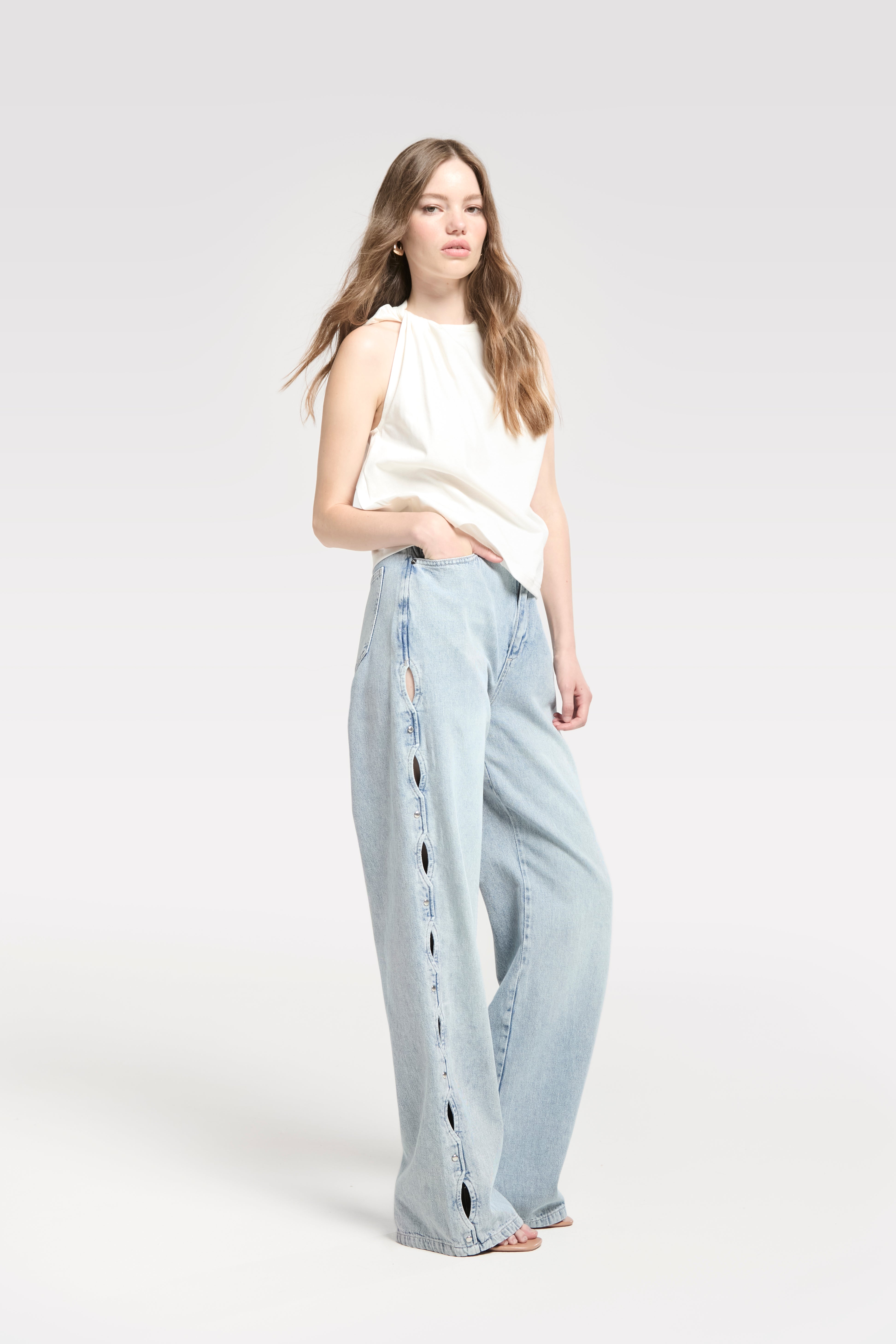 Contemporary and effortlessly stylish, the Straight Jeans with Open Side Detail in Bright Vintage give a classic silhouette a modern twist. Crafted from 100% Cotton, they offer soft, breathable comfort with a structured feel. The open side detailing adds subtle edge and visual interest, making these jeans perfect for pairing with fitted tops, blouses, or casual tees for a versatile, statement-making look.