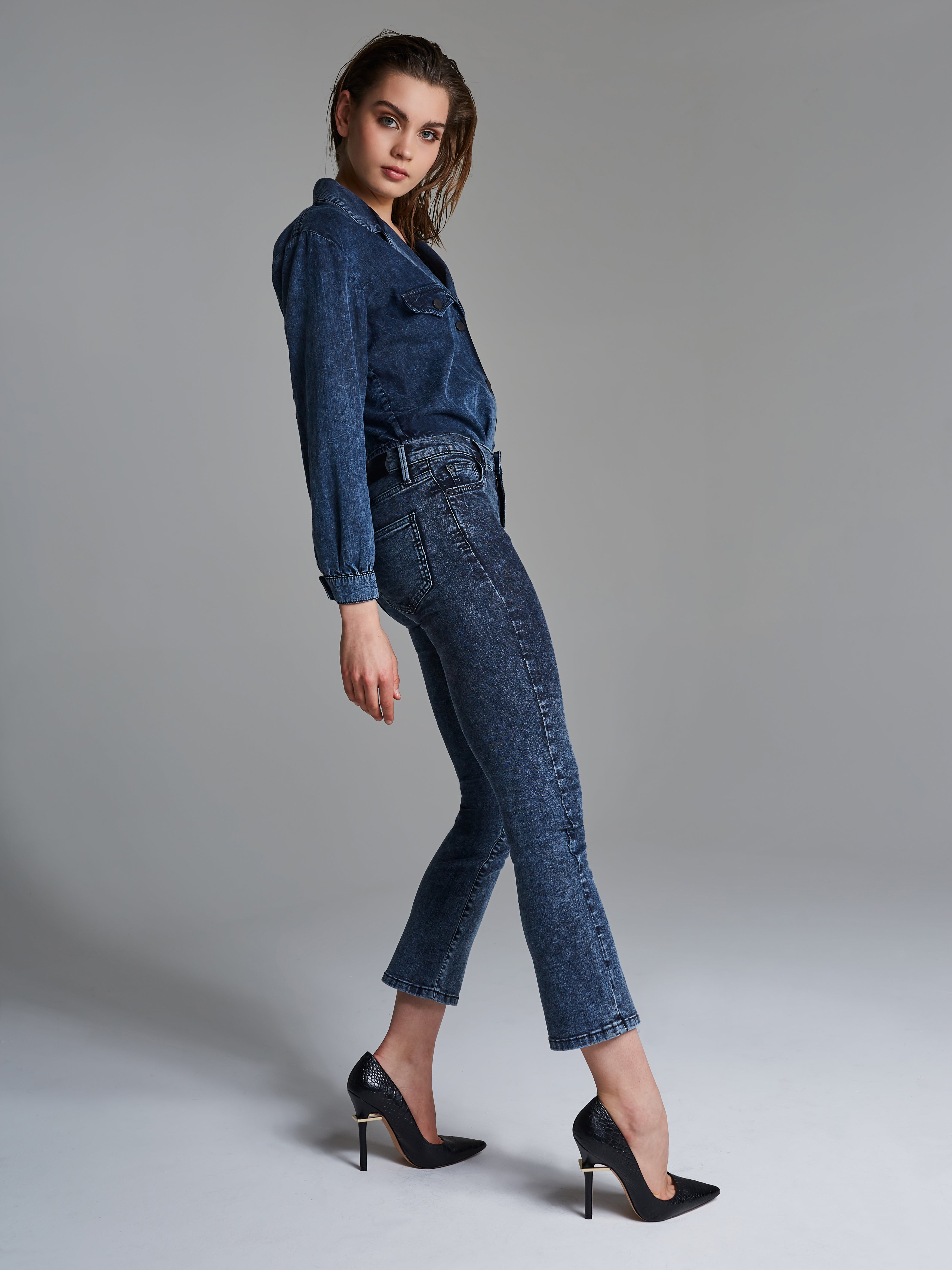 Our ‘Cropped Flared Jeans’ are inspired from the catwalk and finished with the well-known 80’s acid denim wash. This refined retro-inspired denim is making a major comeback this season. Woven with plenty of stretch that won’t lose its shape during the day. These jeans have a high-rise waist and kick-flare shaped hem, with a cropped length. A very comfortable pair to wear.